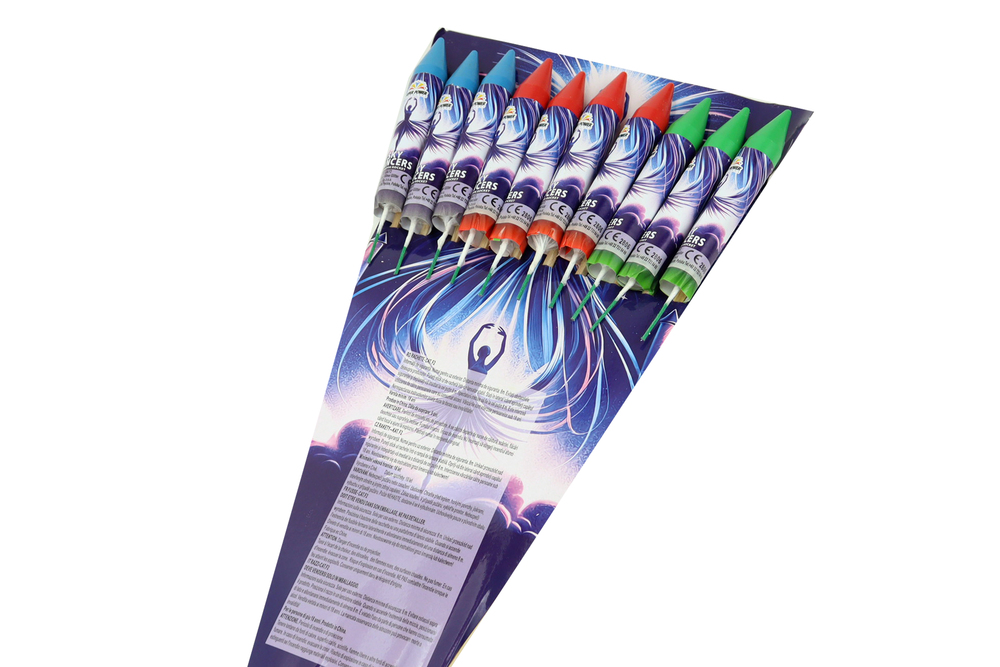 W komplecie znajduje się 10 rakiet z różnorodnymi rozpryskami.