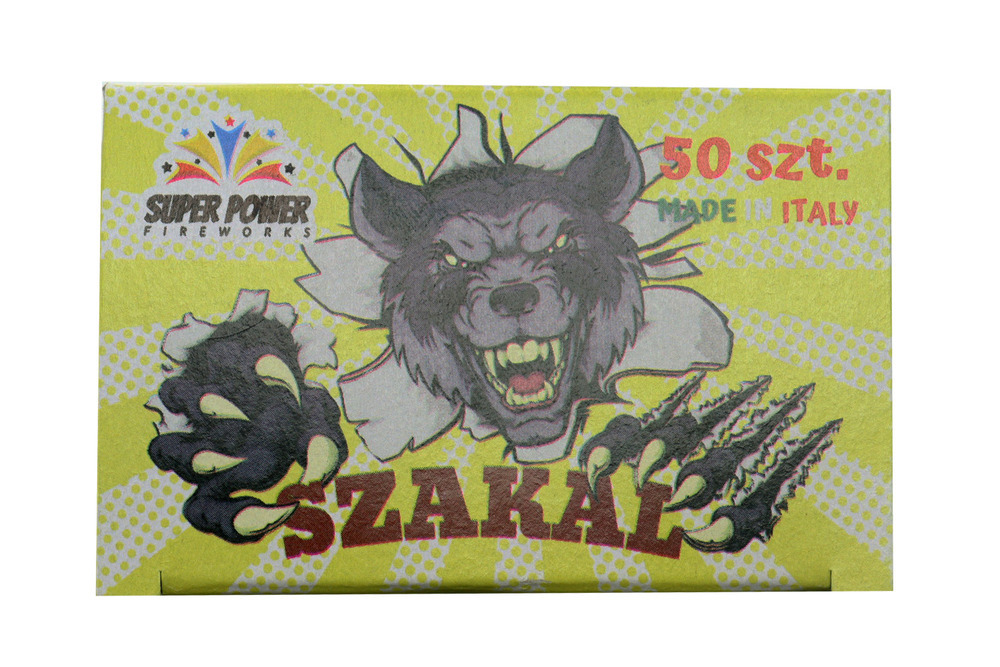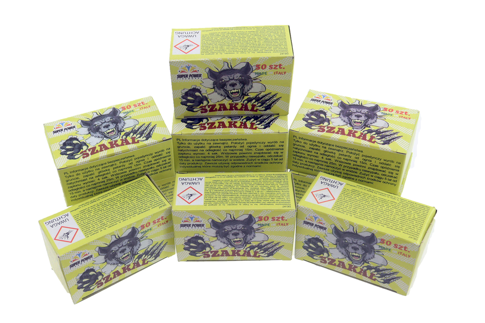 Zestaw zawiera 10 opakowań petard Szakal po 50 sztuk w sumie 500 sztuk.