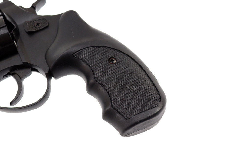 Okładziny rękojeści wykonano z wytrzymałego tworzywa ABS zostały zaprojektowane ergonomicznie zapewniając wygodne i pewne trzymanie rewolweru.