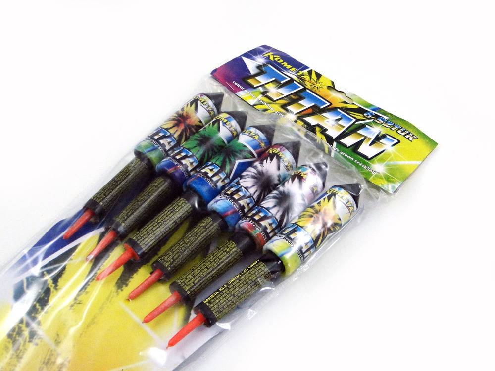 Efekty: trzeszcząca korona z brokatem, kolorowa trzeszcząca piwonia, zielona piwonia z czerwonym stroboskopem, trzeszcząca korona z brokatem, zielona piwonia z czerwonym stroboskopem, kolorowa trzeszcząca piwonia
