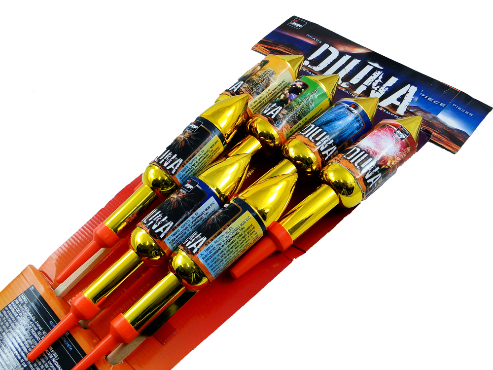 W komplecie znajduję się 7 różnej wielkości rakiet. Każda pojedyncza rakiety ma indywidualny kolor i rodzaj rozprysku.