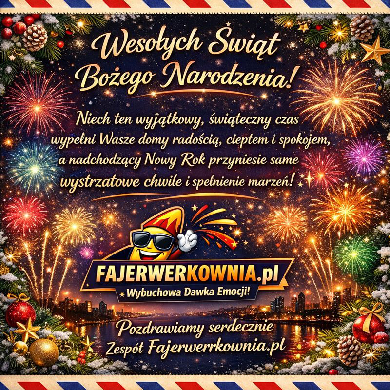 Składamy serdeczne życzenia Bożonarodzeniowe dla obecnych i przyszłych naszych klientów oraz współpracowników.Wesołych Świąt Bożego Narodzenia!Pozdrawiamy serdecznieZespół Fajerwerkownia.pl